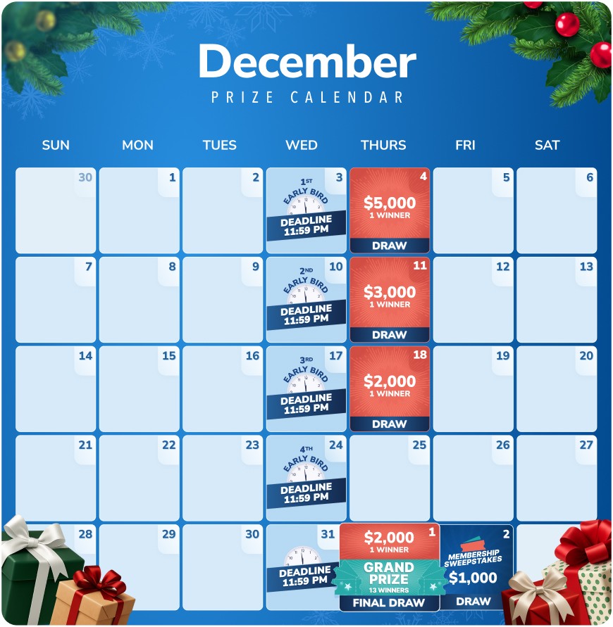 - Weekly Draws- Every Thursday with the exception of Christmas Day ($5000, $3000, $2000, $2000)